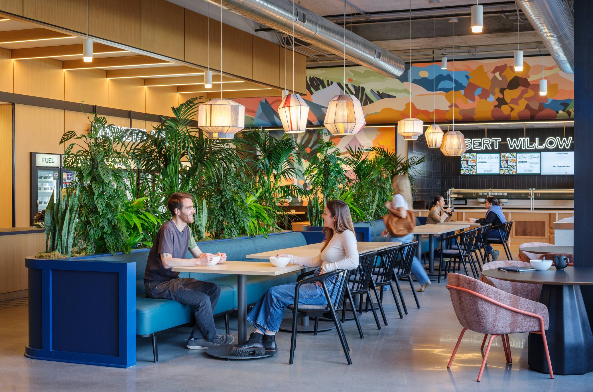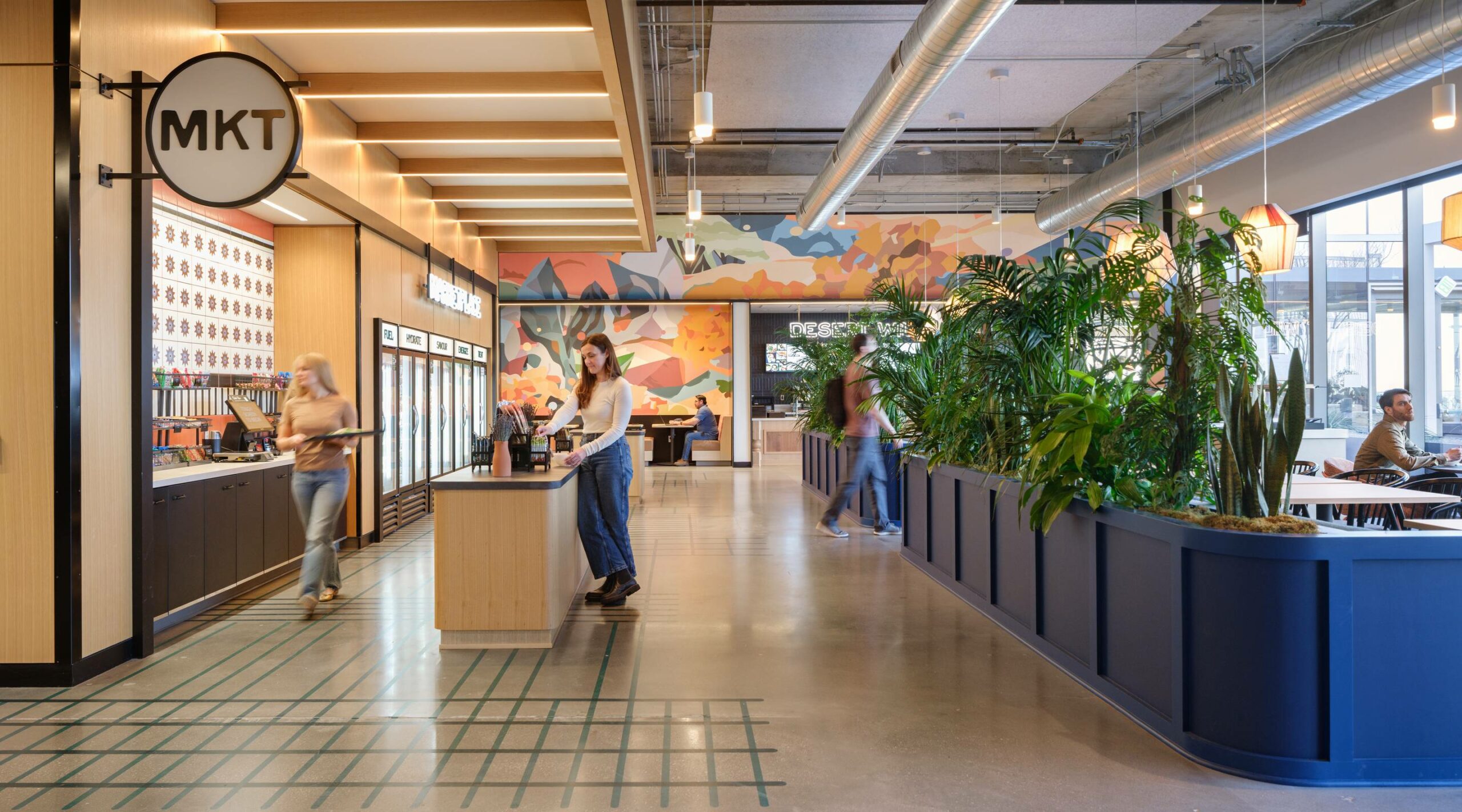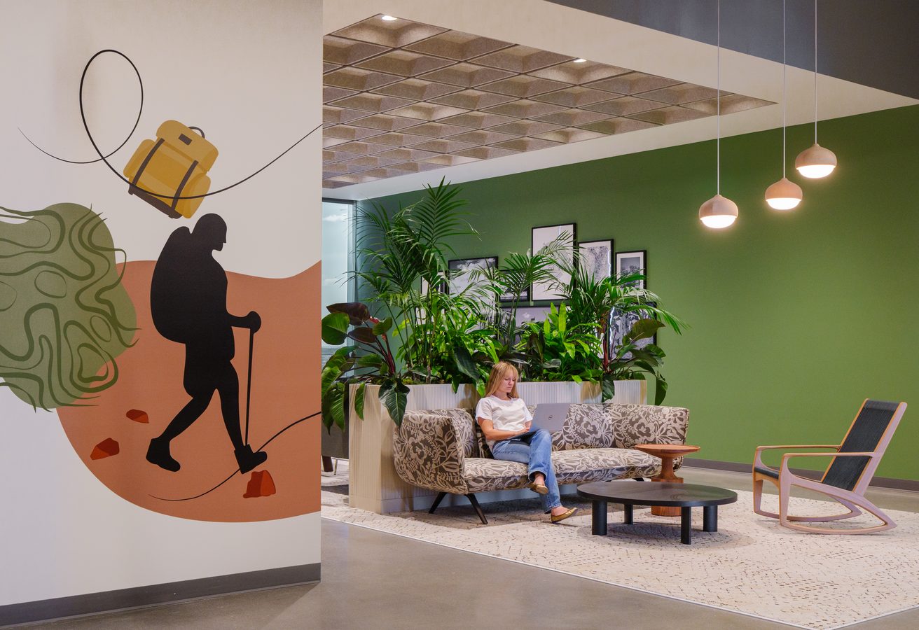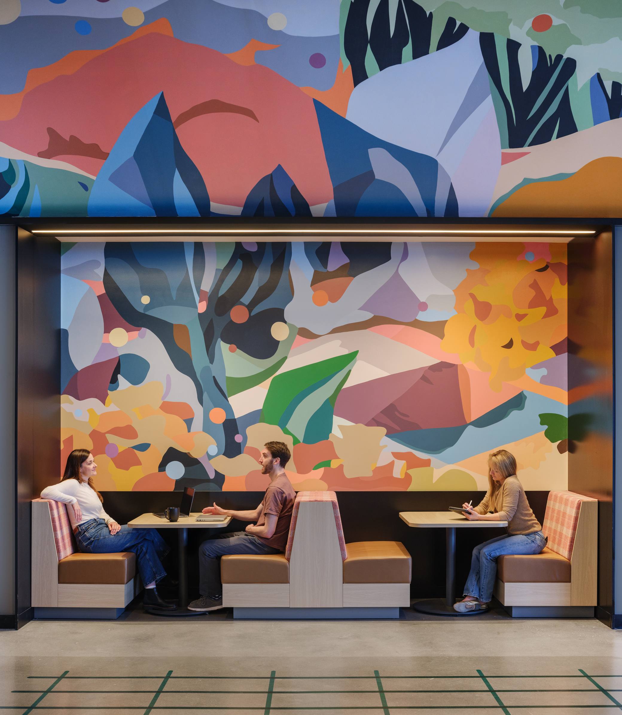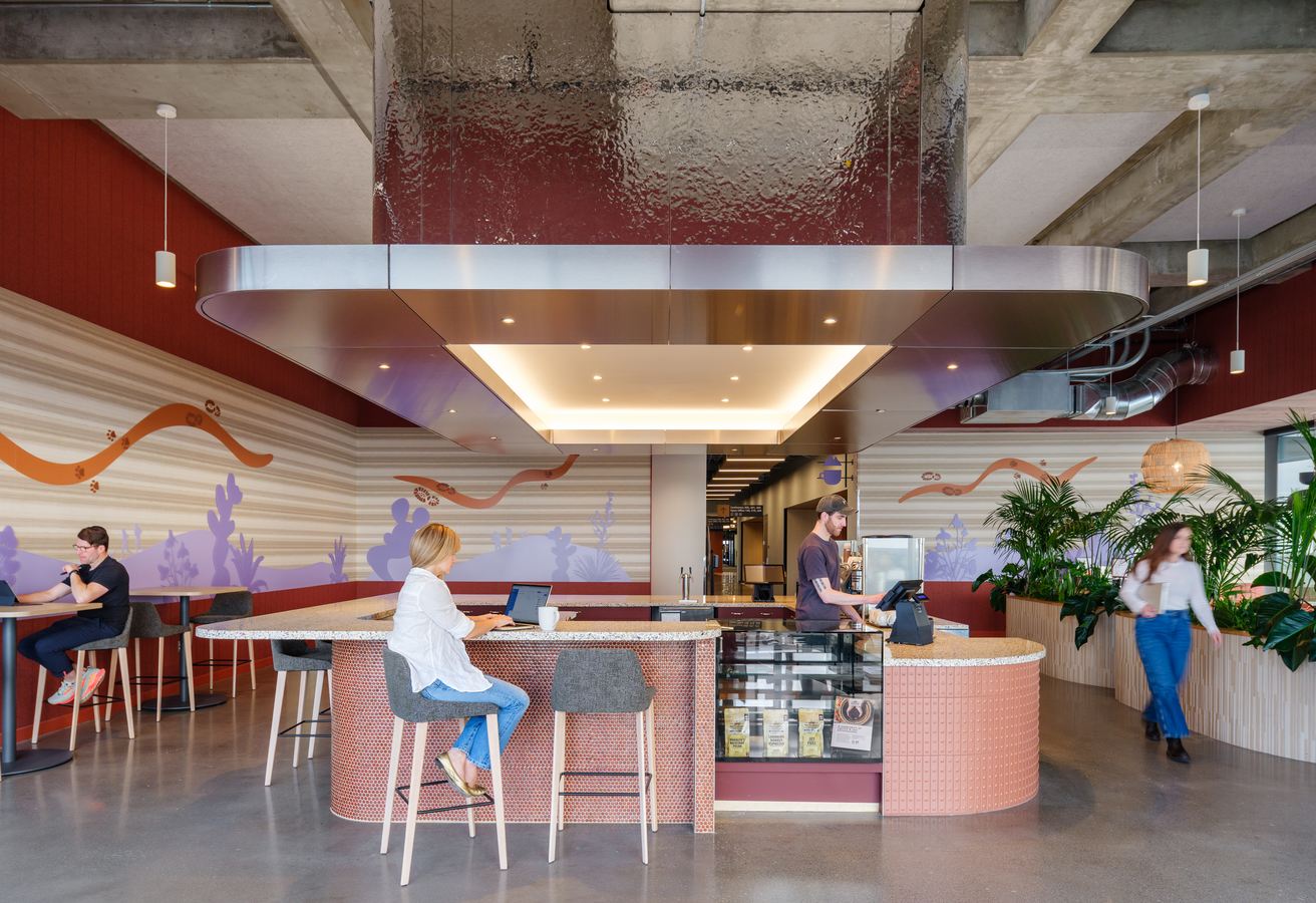 A mural by local artist DAAS wraps the café, infusing the space with Austin’s artistic pulse. Outskirts, the breakout conference area, extends this creative motif, embracing the city’s offbeat authenticity with unexpected, engaging spaces that spark collaboration.