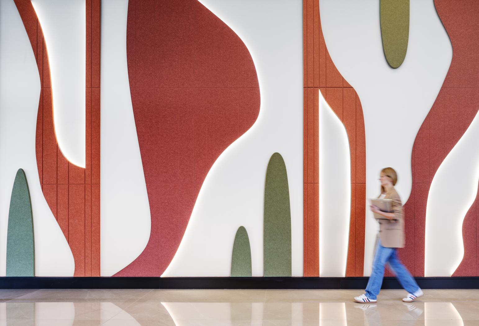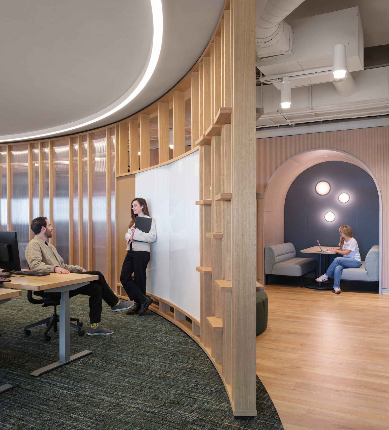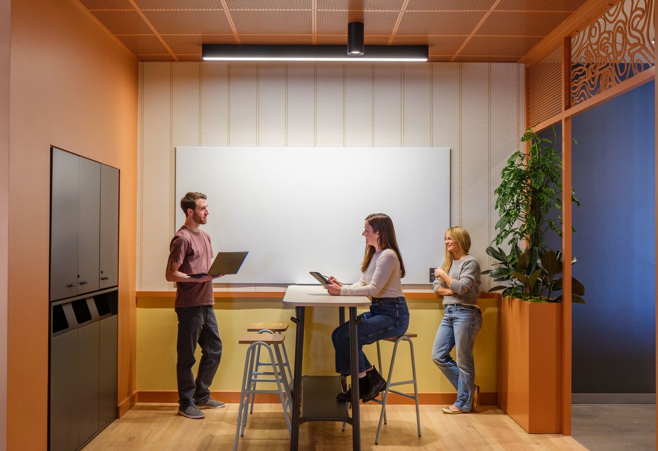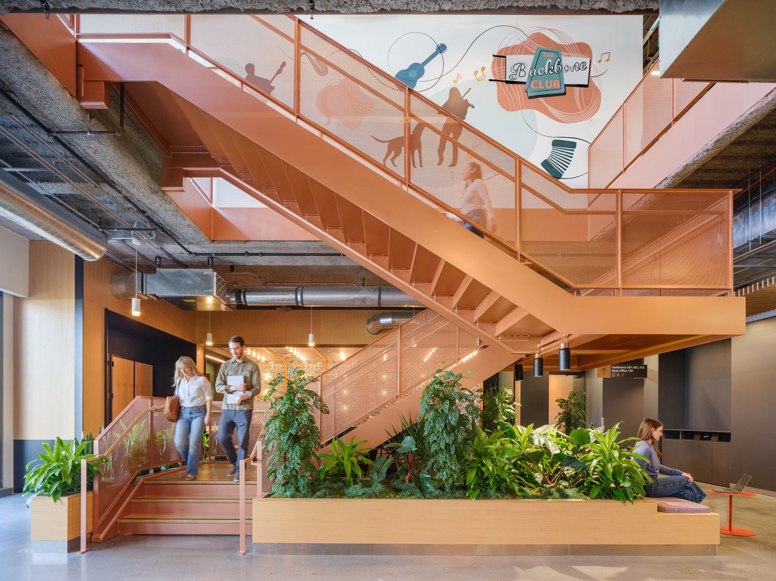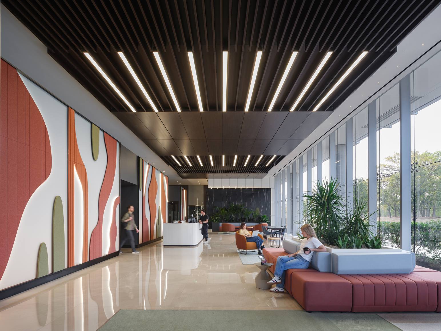 A mural by local artist DAAS wraps the café, infusing the space with Austin’s artistic pulse. Outskirts, the breakout conference area, extends this creative motif, embracing the city’s offbeat authenticity with unexpected, engaging spaces that spark collaboration.
