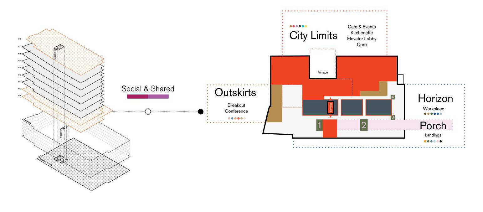 The workplace flows from vibrant social hubs at its core (City Limits and Outskirts) through inviting transitional zones (Porches) into focused, light-filled workspaces along the perimeter (Horizon), creating an energetic yet seamless experience.