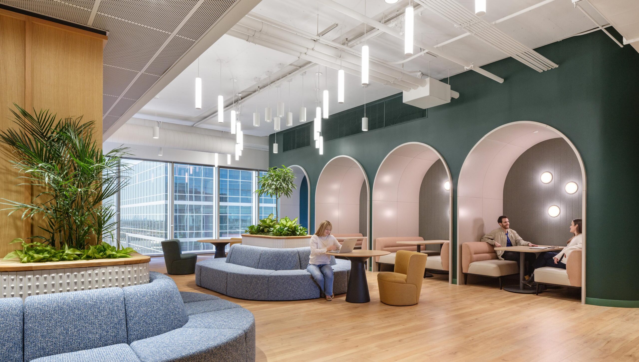 At the heart of the workplace, City Limits brings people together with a café, event space, and kitchenette, channeling Austin’s live music scene, nightlife, and indoor-outdoor lifestyle. Bold colors, rich textures, and a mix of traditional and nostalgic elements celebrate the city’s creative spirit.