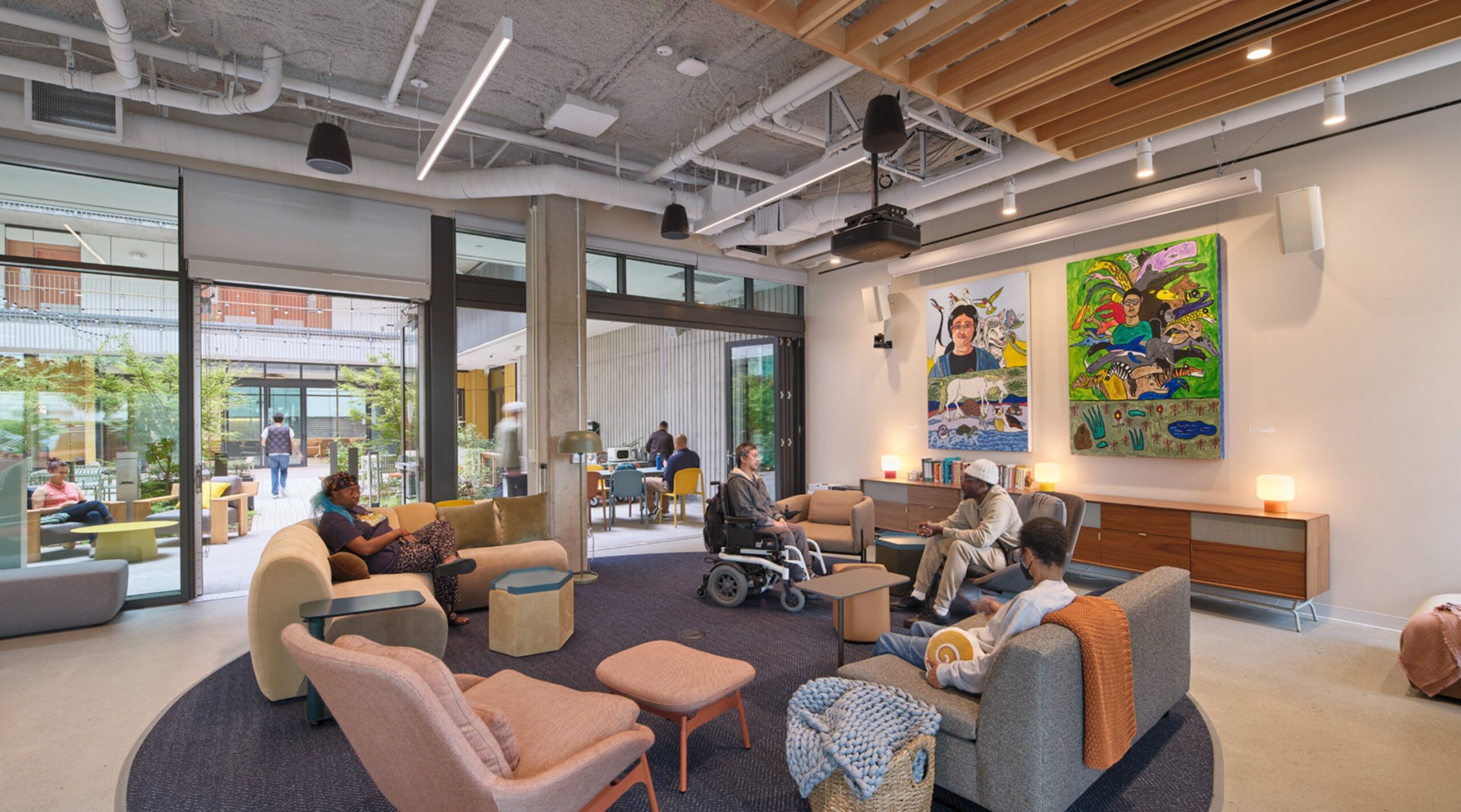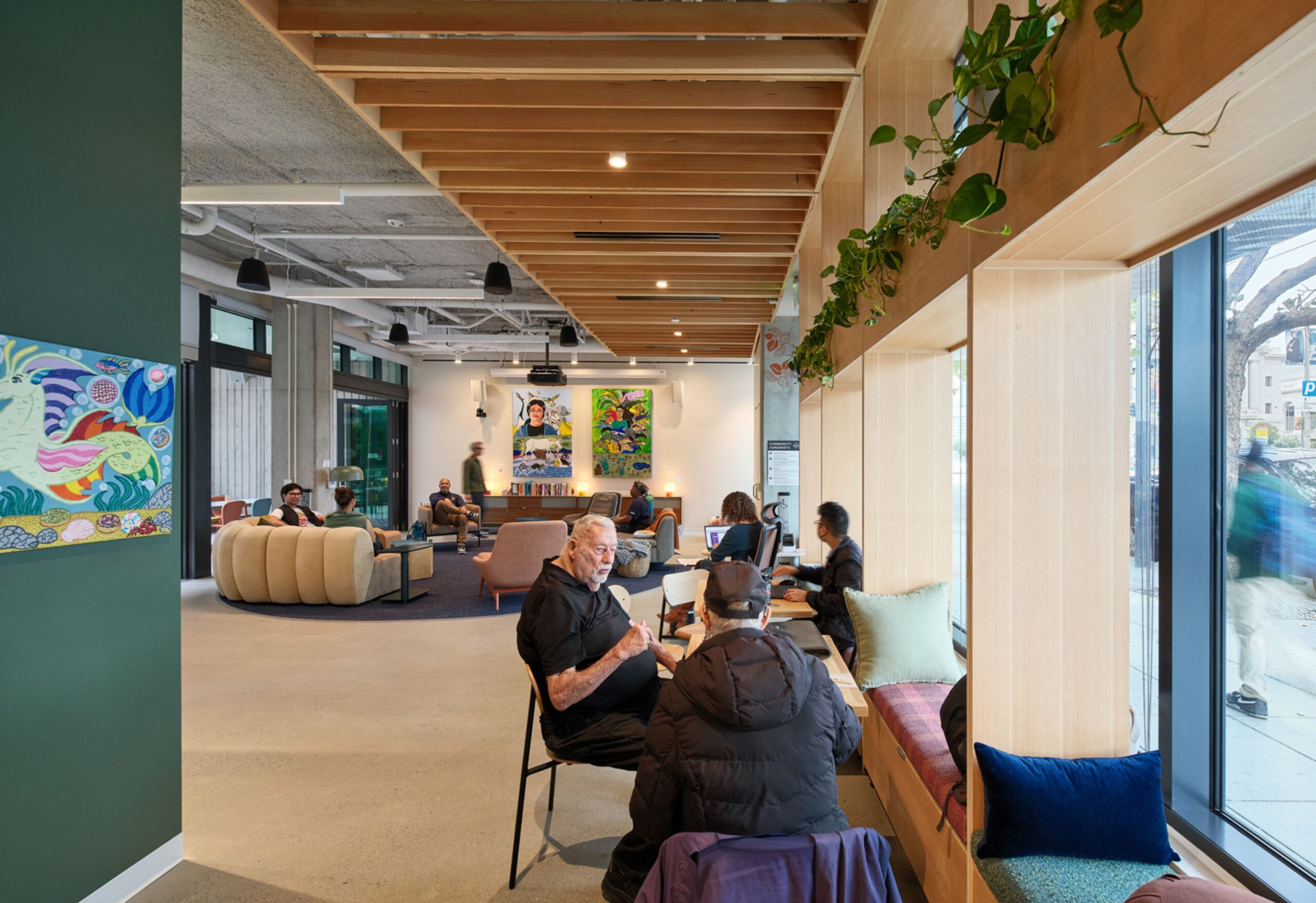 Welcome to the nation’s first publicly funded Disability Cultural Center–a space that elevates disability culture as a vital part of civic life. The center supports a wide range of programming, from virtual and in-person gatherings to advocacy events, workshops, exhibitions, and everyday social use. A flexible, tech-enabled multi-purpose room is complemented by informal gathering areas, encouraging both structured programming and spontaneous interaction. Transparency to the street reinforces visibility and inclusion, making disability culture present and legible within the public realm. Featured artist and San Francisco native, Jay D. Green of Creativity Explored was selected through a public process, and his artwork is translated onto the perforated bi-fold door, which is illuminated at dusk–extending the center’s presence into the city.