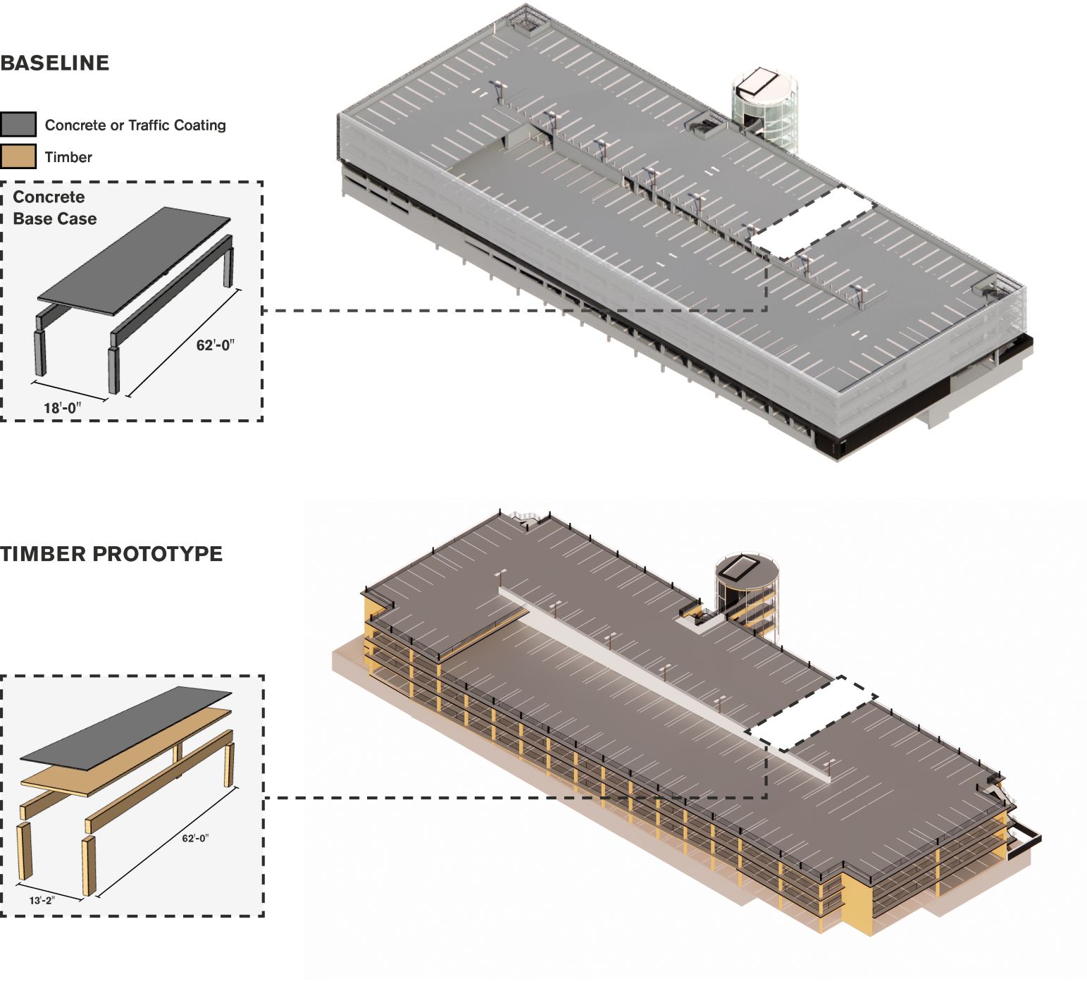 Rather than speculating on idealized futures, this study begins with a recently completed concrete parking structure and asks a direct question: what if this building were constructed in mass timber? Program, layout, and code assumptions are held constant. Structural systems, materials, and assemblies are varied. This approach isolates how design decisions affect carbon, cost, efficiency, durability, and adaptability.