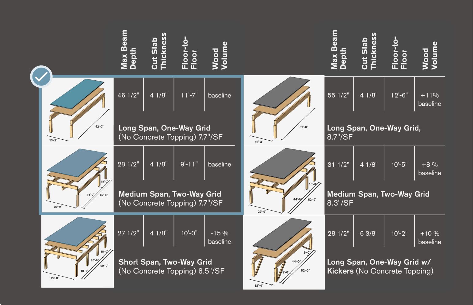 Mass timber framing configurations were tested to balance structural depth, floor-to-floor height, and wood volume with the overall parking experience of a user. While a long span system maximizes parking flexibility and sight lines, it drives up the beam depth and floor-to-floor height. Including columns along one side of the drive aisle (“medium span”), provides a good overall balance of efficiency, adaptability, and sustainability. Both long span and medium span systems were evaluated across carbon, cost, construction duration, and spatial efficiency.